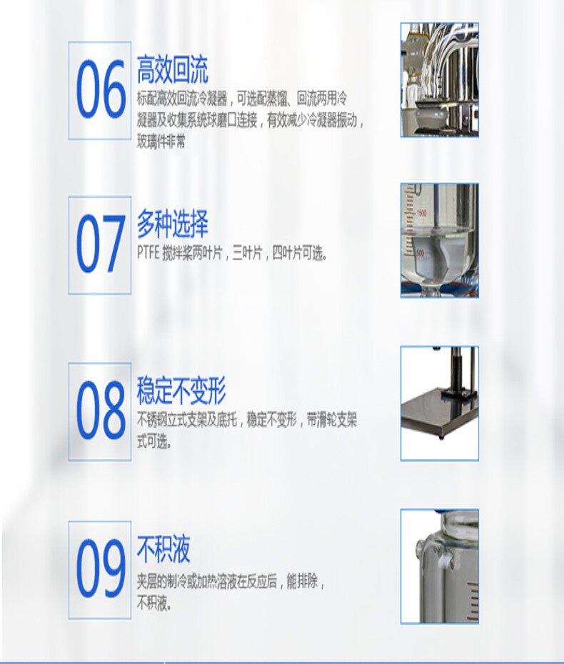 2.標配高效回流冷凝器,可選配蒸餾/回流兩用冷凝器及收集系統 球磨口連接,有效減少冷凝器振動,玻璃件更安全